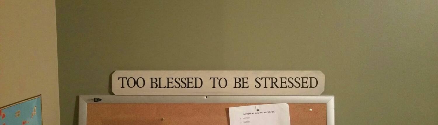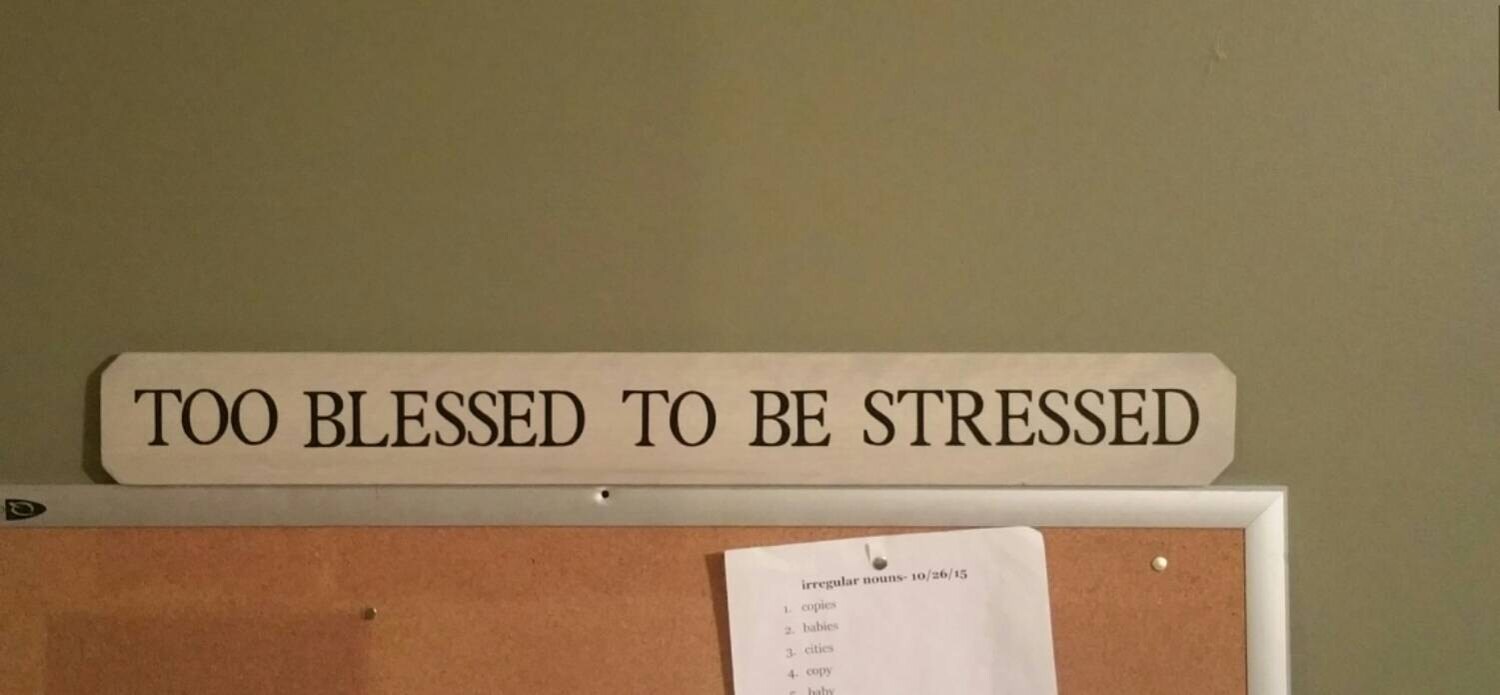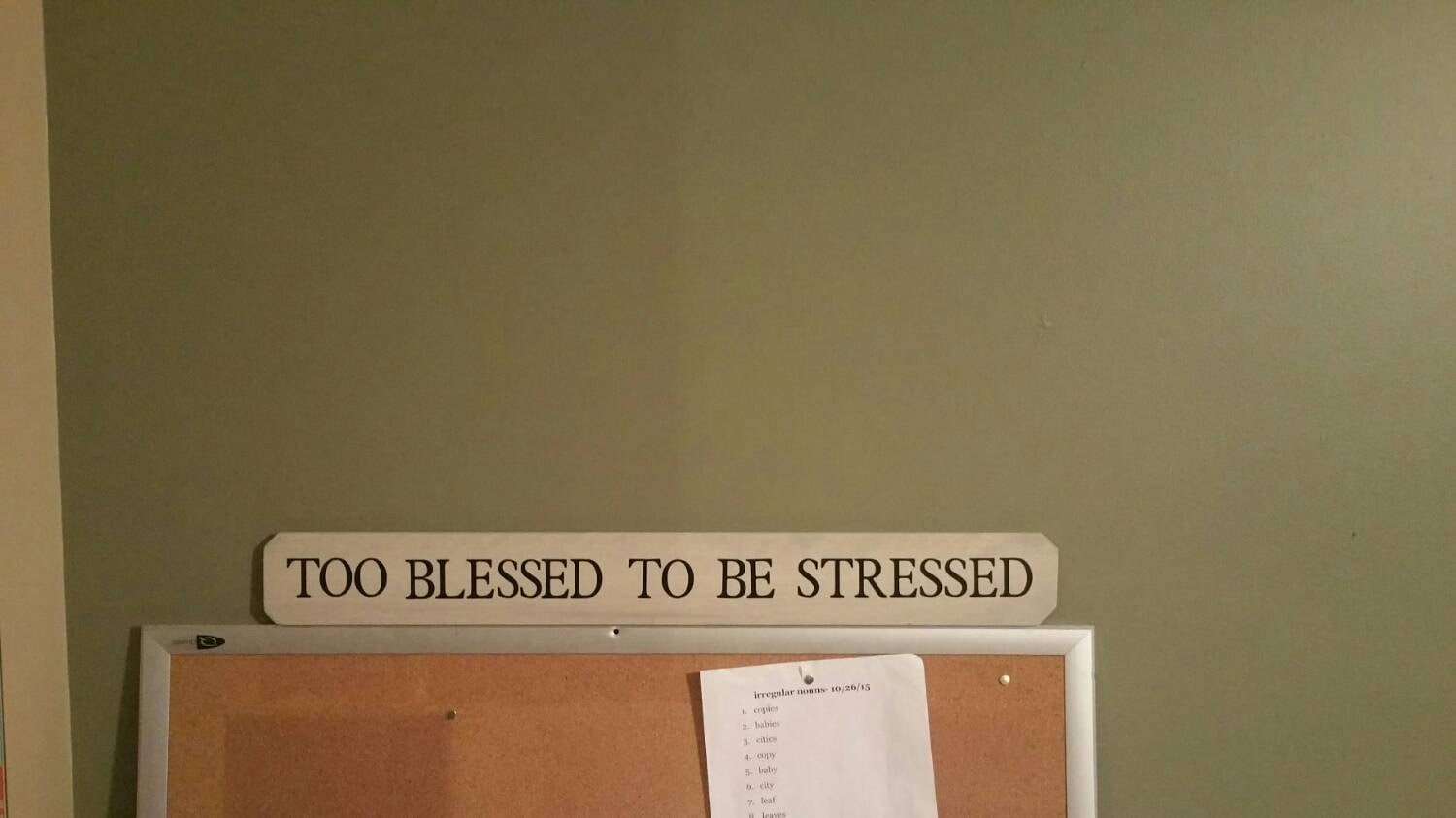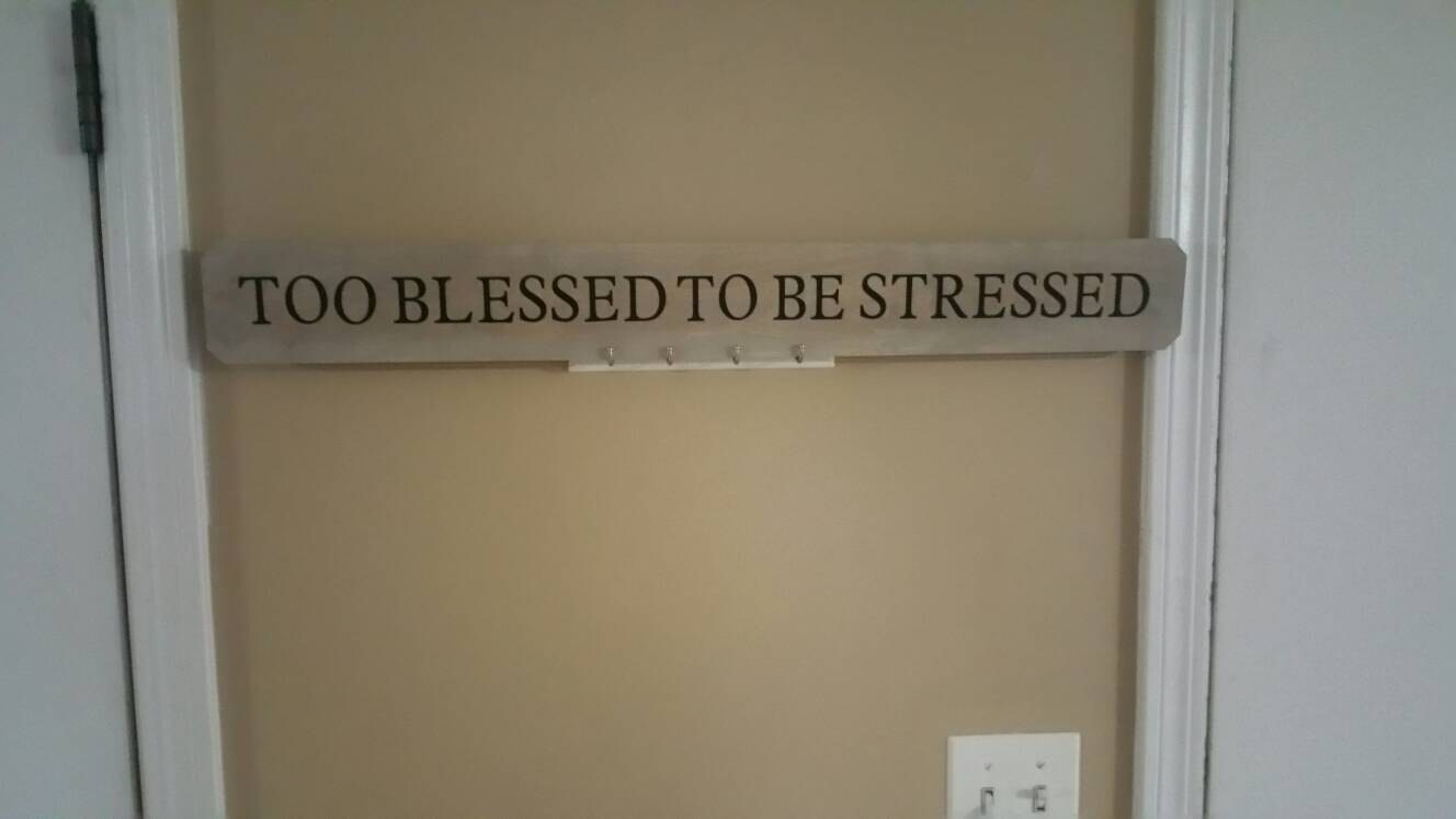 Too blessed to be stressed is 30 inches long and hangs on the wall or set up on a shelf. Stained sumbleached with dark stain accents.